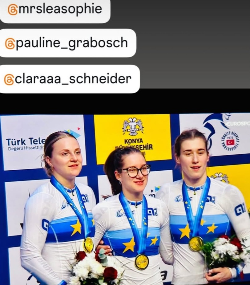 Konya (rad-net) - Die deutschen Teamsprinterinnen haben sich in Konya in der Türkei den Europameistertitel zurückgeholt. Pauline Grabosch, Lea Sophie Friedrich und Clara Schneider siegten hauchdünn vor Großbritannien. Schon in der Qualifikation zeigten die Teamsprinterinnen, dass mit ihnen zu rechnen ist. Mit einer Zeit von 46,276 Sekunden fuhren Pauline Grabosch, Lea Sophie Friedrich (beide RSC Cottbus) und die erst 21-jährige Clara Schneider (RSV Finsterwalde) dort die zweitschnellste Zeit und steigerten sich in der Zwischenrunde bei ihrem Sieg gegen Italien auf 45,943 Sekunden, was erneut die zweitbeste Zeit war. Im Finale gegen Großbritannien lag das deutsche Trio zunächst eine halbe Sekunde in Rückstand, doch als Schlussfahrerin konnte Grabosch ihre ganze Erfahrung ausspielen, machte Boden gut und sicherte sich und ihren beiden Teamkolleginnen in 45,710 Sekunden und mit gerade einmal drei Tausendstelsekunden Vorsprung die Goldmedaille. Maximilian Dörnbach, Nik Schröter (beide RSC Cottbus) und Luca Spiegel (RV Offenbach) belegten im Teamsprint der Männer den fünften Platz.